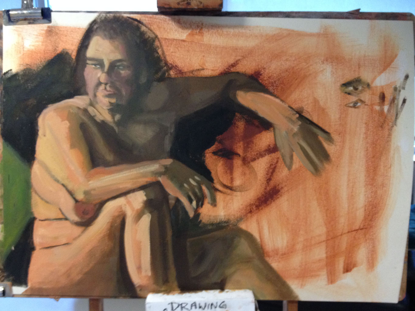 Catching up with the now. This is the painting from the life drawing lesson last Thursday. Using the flip side of the cardboard from the week before (still no canvas). I tore of the finish layer creating a very fluffy layer underneath. Bad idea. It became even more absorbent than with the finish. Never mind. Pay day on Friday so I can get some new canvases. Still using Oils with a Life model over 2 hours. A focus on colour mixing. The image itself is maybe not so great but I am pleased with the colour choices. The dark green/brawns add a real depth that I haven’t always achieved with my other paintings. The face is terrible again, not a good likeness. You may note the eyes on the far right of the board and my utter failure to recreate the effect in the actual image. Next week I may go bigger with the face so that i can focus on these details. I have a habit of trying to fit the hands and the head into the one image. I need to stop doing this and focus on more specific areas and make them bigger on the canvas. Or ask the model to put the hands nearer the head 😉