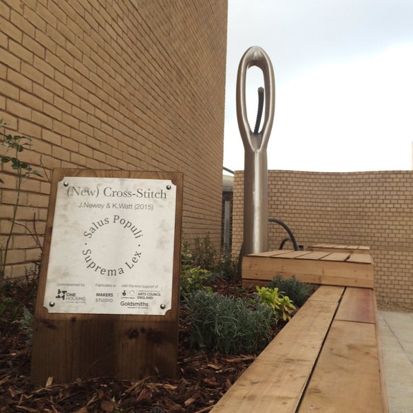 The piece is called ‘New cross stitch’ and can be found around the corner from  New Cross station in London. Drawing on local history the piece is represented by the line ‘Salus populi suprema lex’ (Latin “The health of the people should be the supreme law”). Within the piece we reference local history of new cross as the heart of Haberdashery in London and the old brick pits which the site is built on. I would like to thank Goldsmiths University. Makers Studio and the One Housing group for making this all possible.